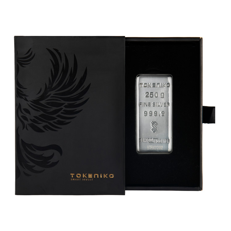 شمش نقره خالص 250 گرمی توکنیکو با درصد خلوص 99.9 با ابعاد و وزن مطابق با استانداردهای بین المللی، به روش casting (ریخته گری) تولید میشود. تمامی مشخصات شمش از جمله وزن، عیار، لوگو برند تجاری توکنیکو و تایید کننده این محصول، بر روی آن حک شده است. همچنین شماره سریال انحصاری هر محصول بر روی خود محصول درج شده است. این شمشها دارای تأییدیه سازمان جهانی فلزات گرانبها میباشند.